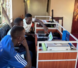 A staff member of Godly Hands International instructing a group of youth in computer literacy, demonstrating the organization’s dedication to providing high-quality educational support. The students are attentively engaged as